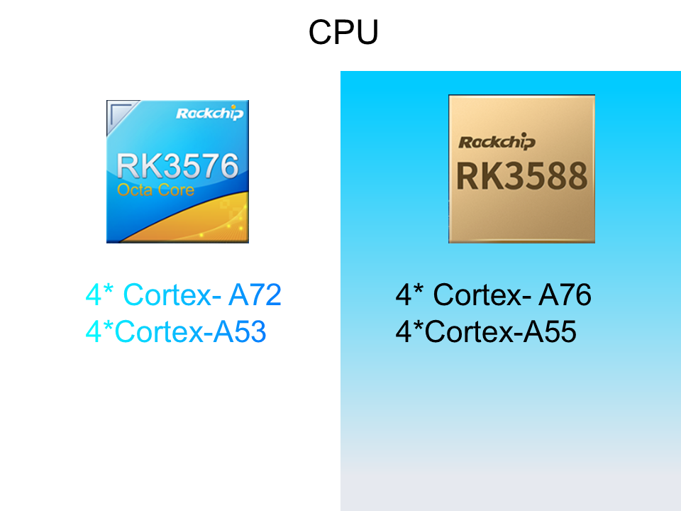 CPU-prestaties: RK3588 maakt gebruik van quad-core cortex-A76 + quad-core cortex-A55, terwijl RK3576 gebruik maakt van quad-core cortexa72 + quad-core cortex-A53-architectuur voor kostenoverwegingen en is uitgerust met arm cortex m0 coprocessor, die meer mogelijkheden blijkt voor gerelateerde toepassingen.