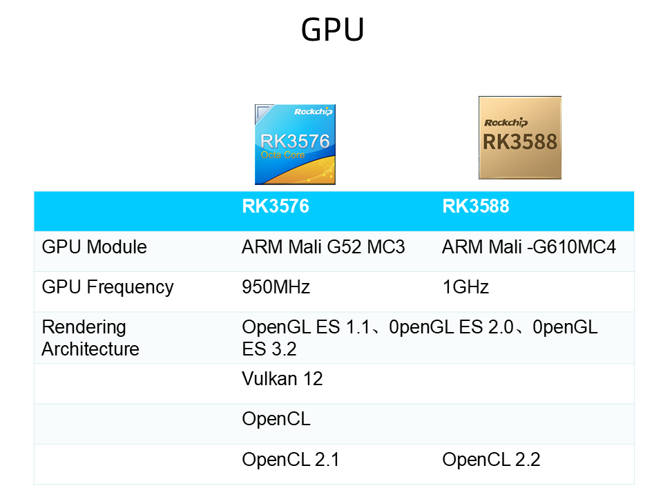 Ze ondersteunen beide OpenGL ES 1.1, 2.0 en 3.2, Vulkan 1.2, maar RK3588 is hoger in OpenCL -versie (RK3588 ondersteunt 2.2).