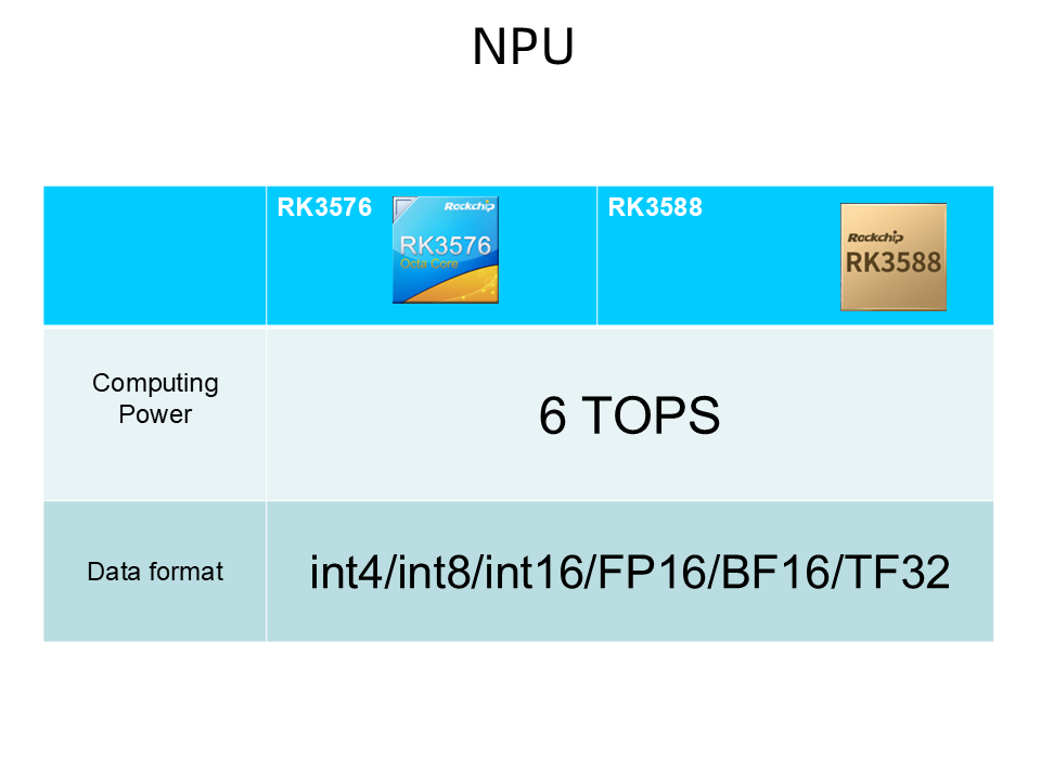 RK3588 en RK3576 zijn uitgerust met 6TOPS -computervermogen, ondersteunen gegevensformaten zoals int4int8/int16/fp16/bf16/tf32 en zijn geschikt voor een verscheidenheid aan AI -toepassing scenario's.