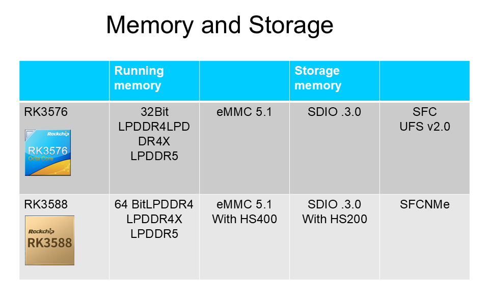 RK3588 ondersteunt64-bitLPDDR4/LPDDR4X/LPDDR5, EMMC5.1: met HS400, SDI03.0 met HS200 en NME en SFC. De twee zijn verschillend in geheugengegevensbitbreedte (64bit versus 32bit).