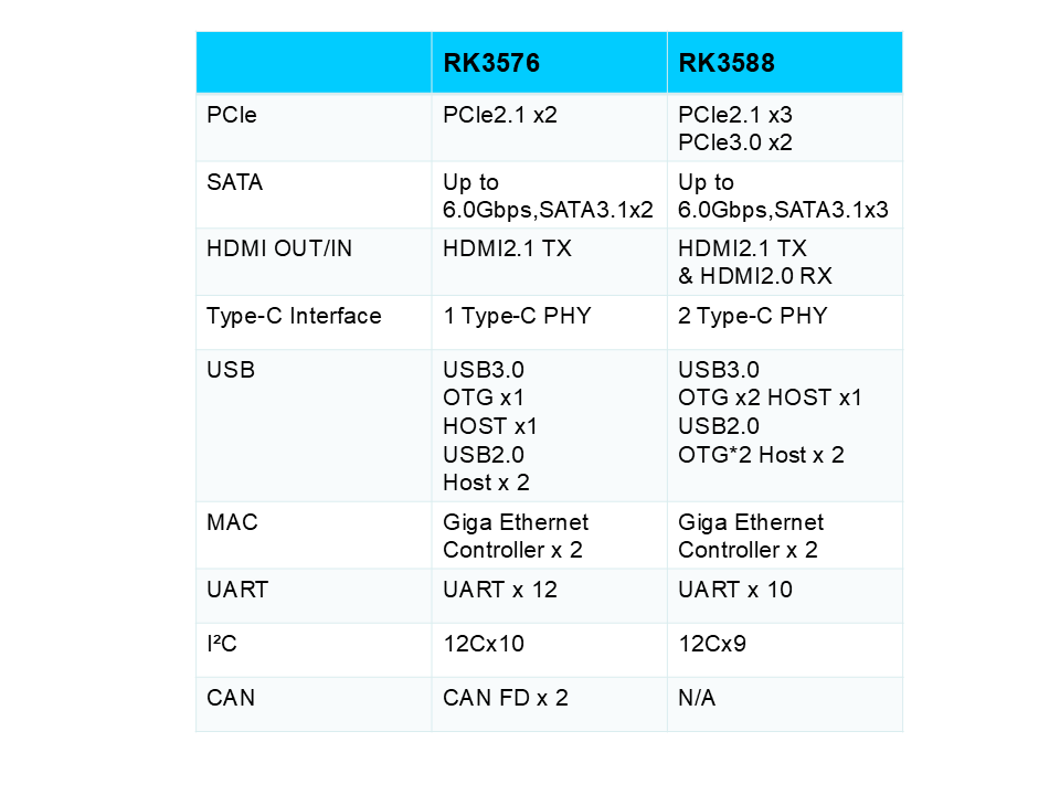 Zowel RK3588 als RK3576zijn uitgerust met rijke interfaceconfiguraties, waaronder PCIe/ SATA/ Type C/ USB3.0/ USB2.0/ Dual Network Ports/ Meerdere seriële poorten om te voldoen aan verschillende vereisten voor producttoepassingen.