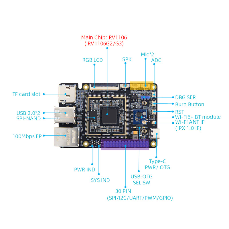 Gebruik Rockchip RV1106 als de hoofdchip, met single-band wifi6+BT5.2 draadloze module USB2.0-host, 100m Ethernet, TF-kaarthouder, MIPI-camera, microfoon, SPK en andere randapparatuur, 30Pin configureerbare pins, ondersteuning GPIO, SPI, I2C, UART, PWM-functies.